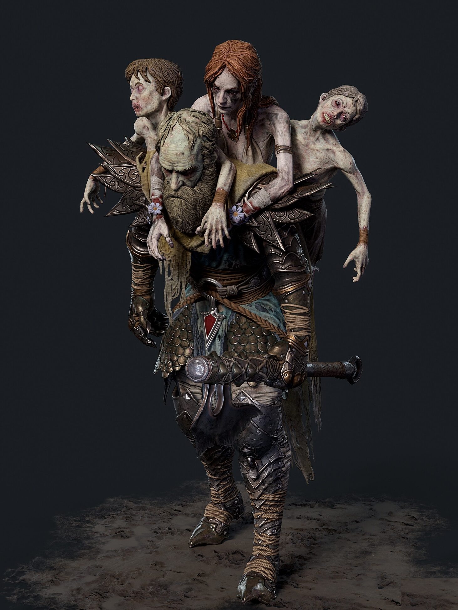 Dopo non troppo tempo, mentre i compagni stavano parlando con Darvinn, il gruppo ha notato una cosa inquietante: nella loro direzione era in arrivo una figura torreggiante. Questa creatura dalle dimensioni esagerate e dall’aspetto raccapricciante non era il cavaliere visto poco prima. Il volto era molto simile ma la stazza di gran lunga maggiore; ormai visibilmente trasformato e ingigantito, il vecchio presentava delle escrescenze, come dei corpi uscire fuori dalla sua schiena. Questi sembrano appartenere ai suoi familiari defunti.